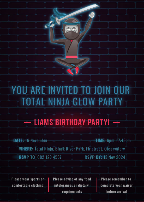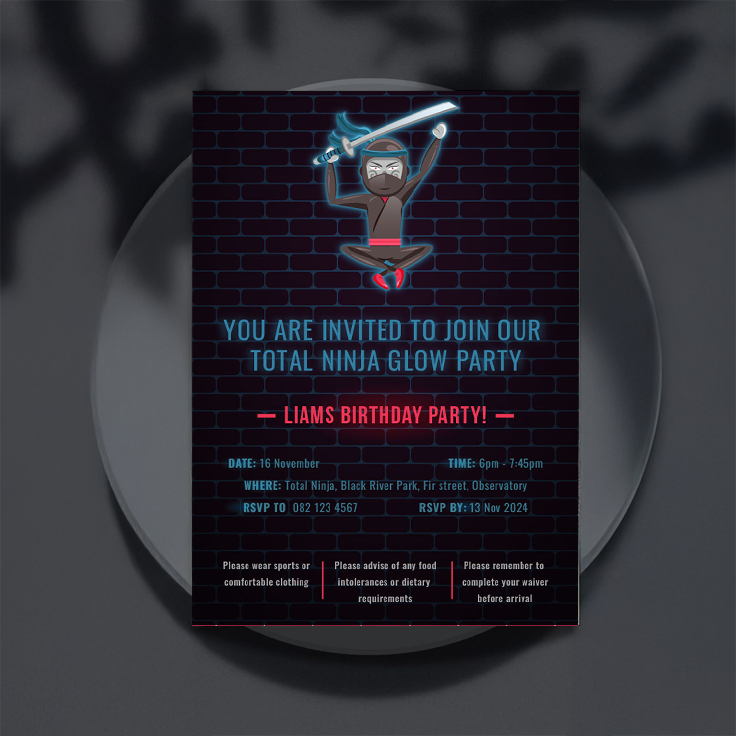 With bold ninja graphics, throwing stars, and shadowy vibes, this invite kicks off the action and gets guests ready to train, snack, and celebrate in style.